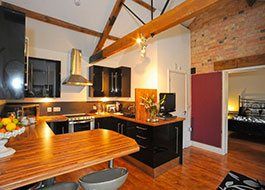 This two bedroom converted stable at Outfields Farm Bedford is a stunning place to stay!The open plan kitchen/living room with is vaulted ceiling, exposed beams and brick walls create a spectacular living space.